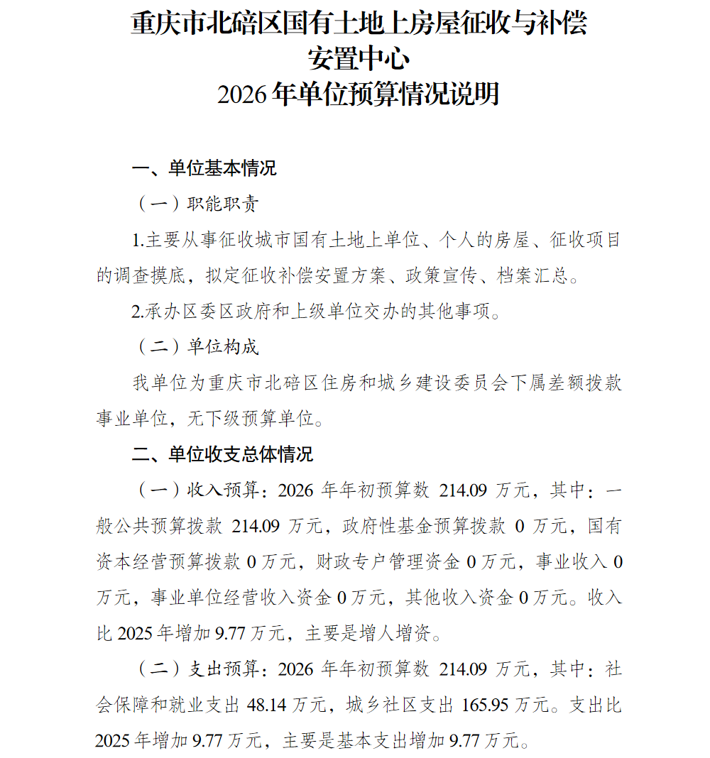 重庆市北碚区国有土地上房屋征收与补偿安置中心2026年单位预算情况说明