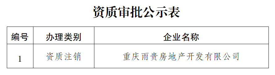 为规范我区房地产开发企业资质审批工作,保证资质审批公正性,增加审批工作透明度,现将重庆雨贵房地产开发有限公司房地产开发企业二级资质注销审批情况进行公示,以广泛接受社会监督。公示时间为:2025年9月18日至2025年9月27日,如企业对结果有异议,需在2025年9月27日前以书面形式提供陈述材料,并加盖本单位印章后报送我委,逾期不予受理(邮寄的陈述材料以邮戳日期为准)。任何有关单位及个人,如对企业申报资质情况有不同意见需要反映的,请在公示期内以书面形式将反映的情况寄(送)到北碚区政务服务中心4楼420号窗口,单位反映情况要加盖公章,个人反映情况要签署真实姓名,并需留下真实的联系电话、地址、邮编。