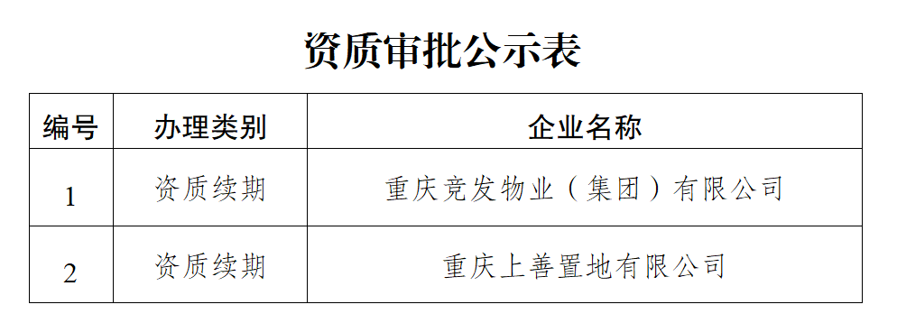 为规范我区房地产开发企业资质审批工作,保证资质审批公正性,增加审批工作透明度,现将重庆竞发物业(集团)有限公司、重庆上善置地有限公司两家房地产开发企业二级资质续期审批情况进行公示,以广泛接受社会监督。公示时间为:2025年9月26日至2025年10月5日,如企业对结果有异议,需在2025年10月5日前以书面形式提供陈述材料,并加盖本单位印章后报送我委,逾期不予受理(邮寄的陈述材料以邮戳日期为准)。任何有关单位及个人,如对企业申报资质情况有不同意见需要反映的,请在公示期内以书面形式将反映的情况寄(送)到北碚区政务服务中心4楼420号窗口,单位反映情况要加盖公章,个人反映情况要签署真实姓名,并需留下真实的联系电话、地址、邮编。