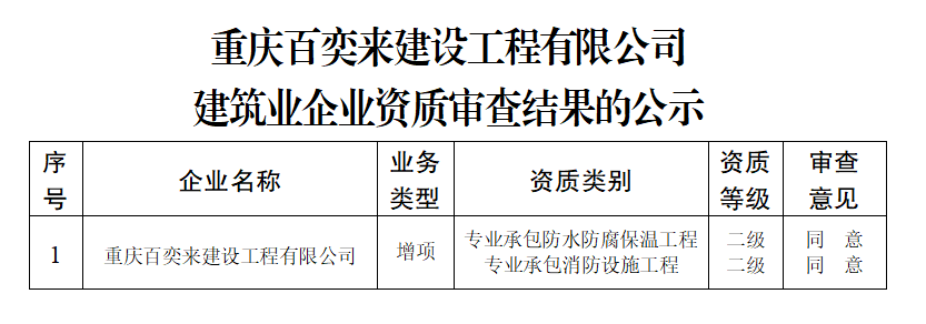 按照《中华人民共和国行政许可法》《建筑业企业资质管理规定》(住建部令第22号)《建筑业企业资质等级标准》(建市〔2014〕159号)和《建筑业企业资质管理规定和资质标准实施意见》(建市〔2015〕20号)的规定,经企业申报,我委近期对重庆百奕来建设工程有限公司企业申请建筑业企业资质的申请材料进行了审查,现将审查意见予以公示。公示截止日期为2025年10月26日。