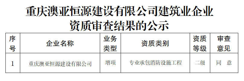 按照《中华人民共和国行政许可法》《建筑业企业资质管理规定》(住建部令第22号)《建筑业企业资质等级标准》(建市〔2014〕159号)和《建筑业企业资质管理规定和资质标准实施意见》(建市〔2015〕20号)的规定,经企业申报,我委近期对重庆澳亚恒源建设有限公司企业申请建筑业企业资质的申请材料进行了审查,现将审查意见予以公示。公示截止日期为2025年10月27日。