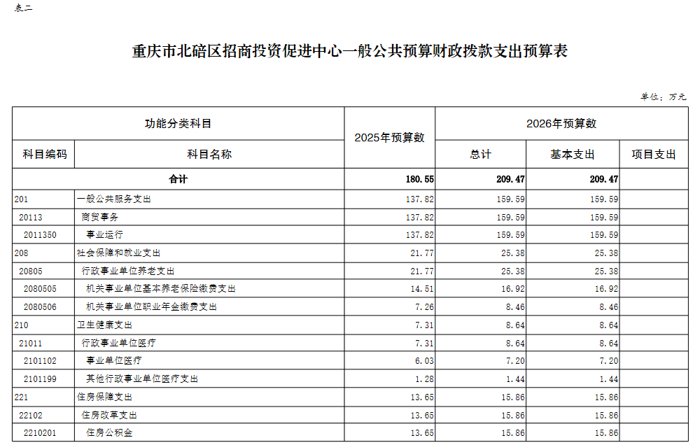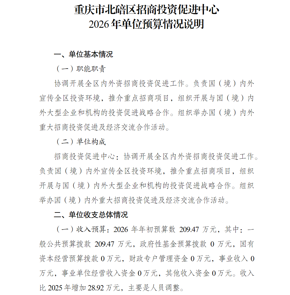 重庆市北碚区招商投资促进中心2026年单位预算情况说明