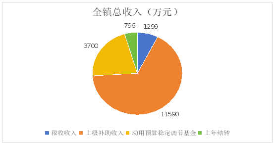 全镇总收入17385万元,其中:税收收入为1299万元、上级补助收入11590万元、动用预算稳定调节基金3700万元、上年结转796万元。
