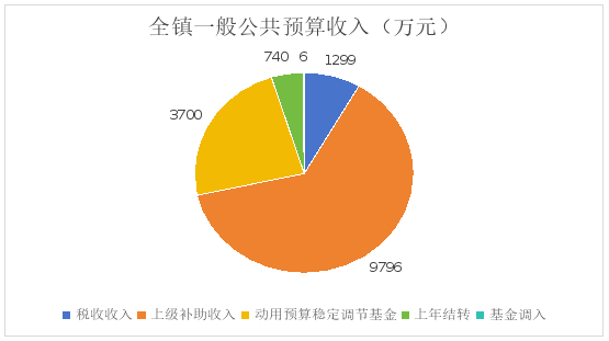 全镇一般公共预算收入15541万元,其中:税收收入1299万元、上级补助收入9796万元、动用预算稳定调节基金3700万元、上年结转740万元、基金调入6万元。
