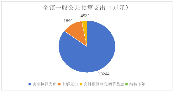 全镇一般公共预算支出15541万元,其中:实际执行支出 13244万元、上解支出1844万元、安排预算稳定调节基金452万元、结转下年1万元。主要支出情况如下:
