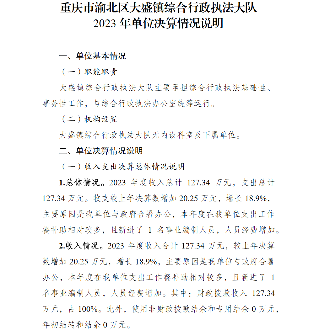 重庆市渝北区大盛镇综合行政执法大队2023年部门决算公开