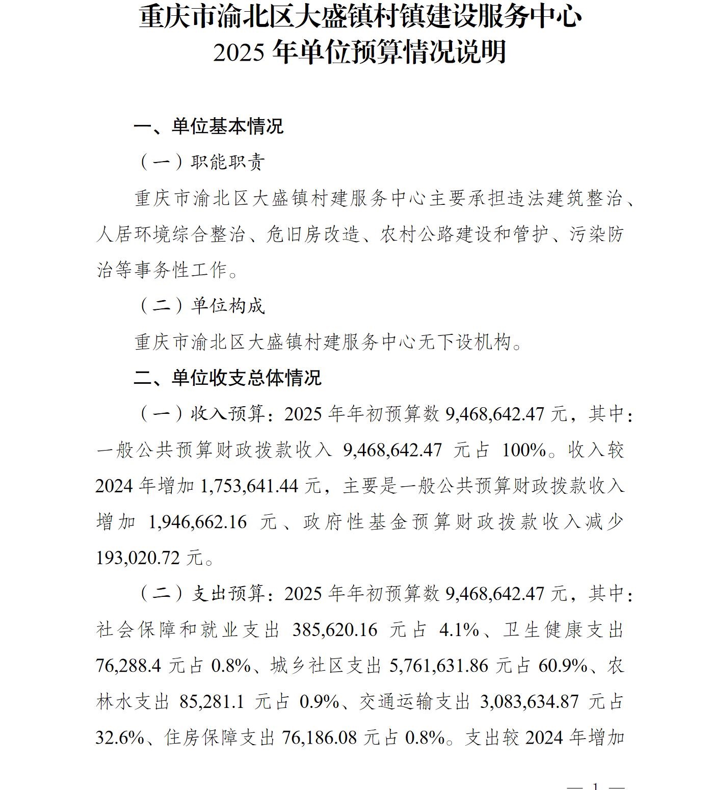 重庆市渝北区大盛镇村镇建设服务中心2025年单位预算情况说明