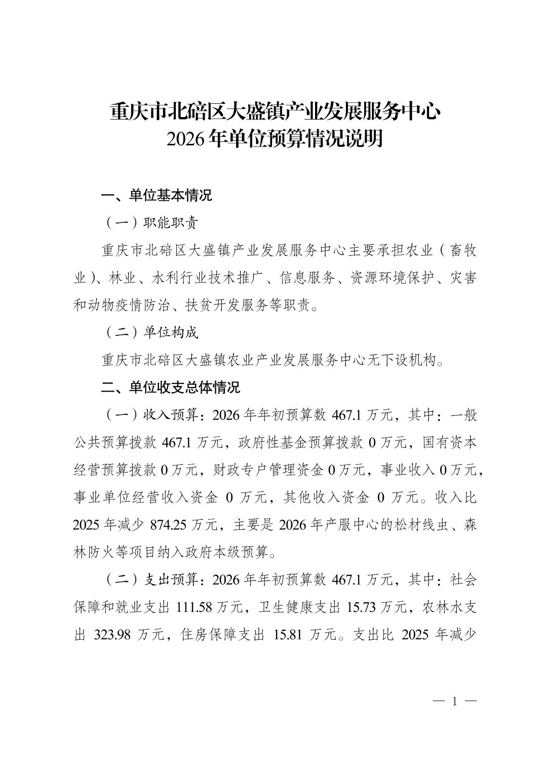 重庆市北碚区大盛镇产业发展服务中心2026年单位预算情况说明
