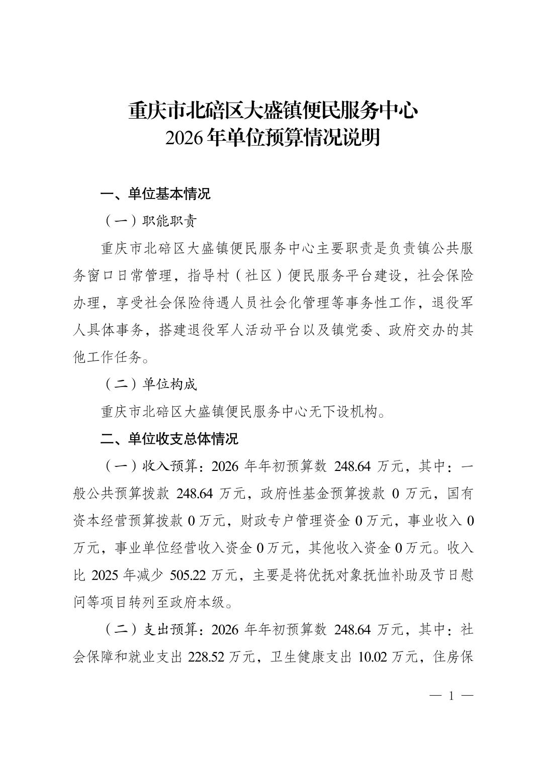 重庆市北碚区大盛镇便民服务中心2026年单位预算情况说明