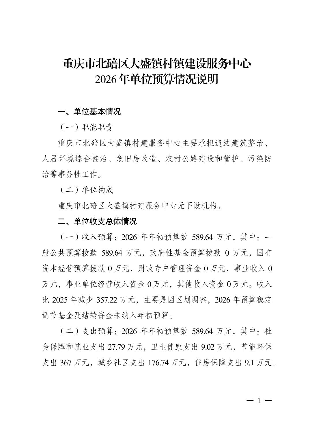 重庆市北碚区大盛镇村镇建设服务中心2026年单位预算情况说明