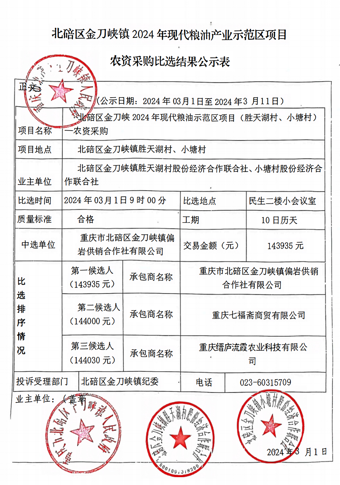 北碚区金刀峡镇2024年现代粮油产业示范区项目农资采购比选结果公示