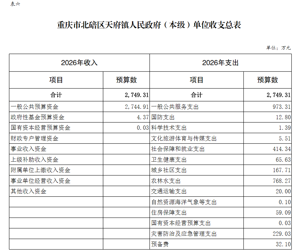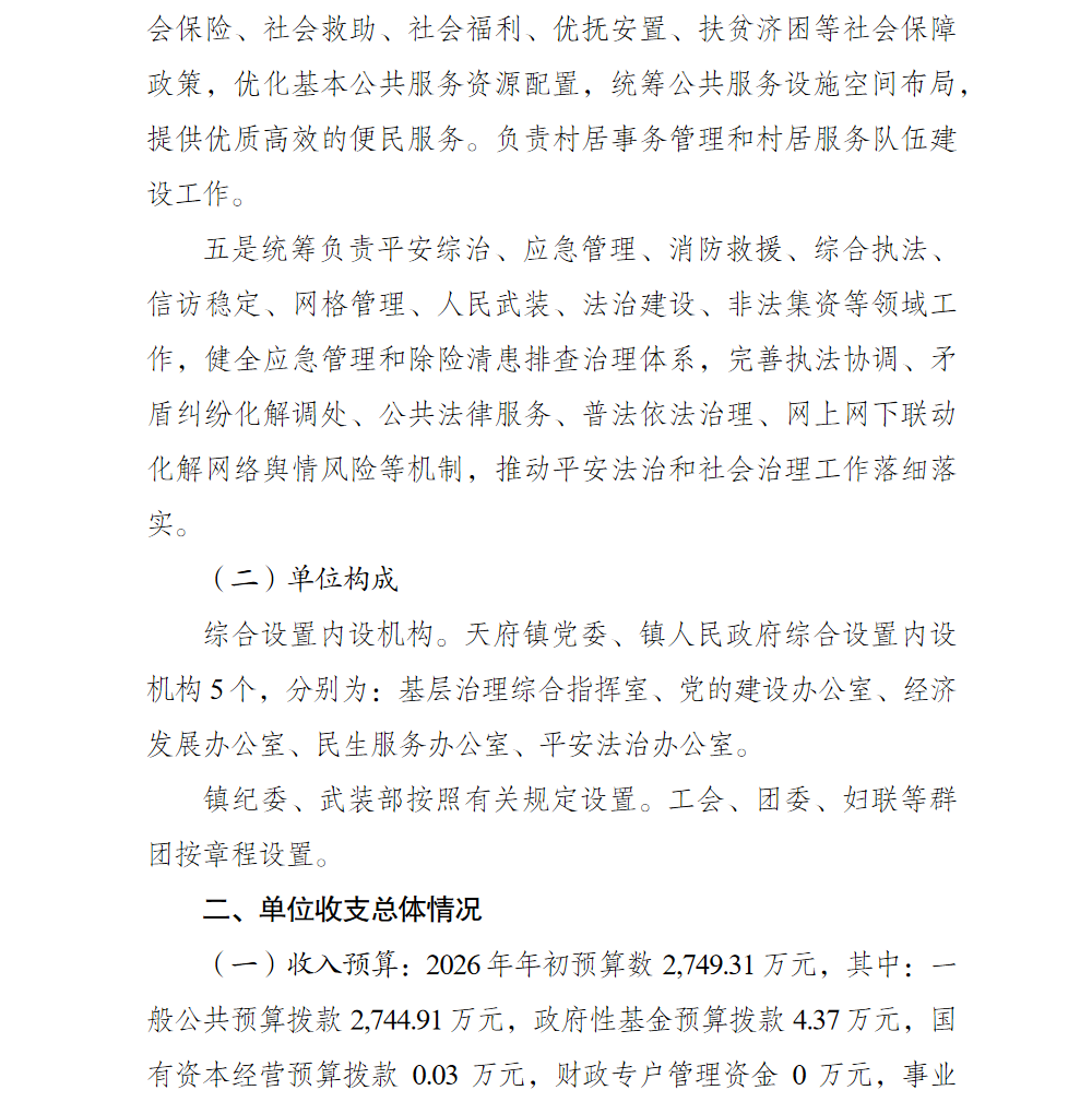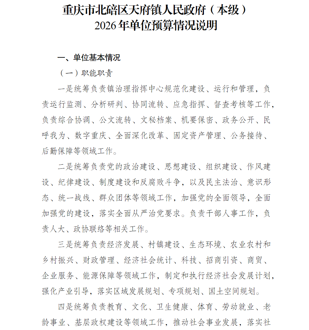 重庆市北碚区天府镇人民政府(本级)2026年单位预算情况说明