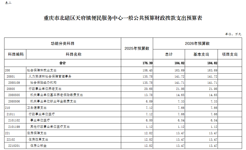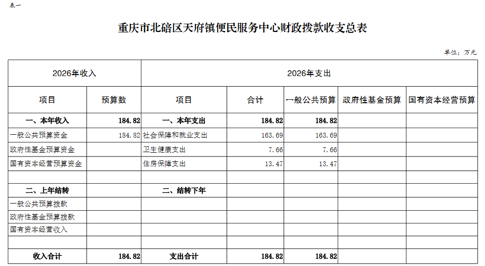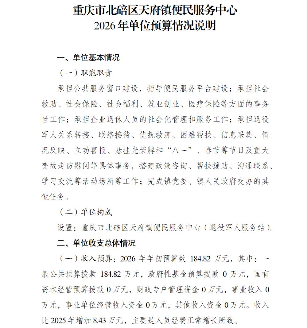 重庆市北碚区天府镇便民服务中心2026年单位预算情况说明