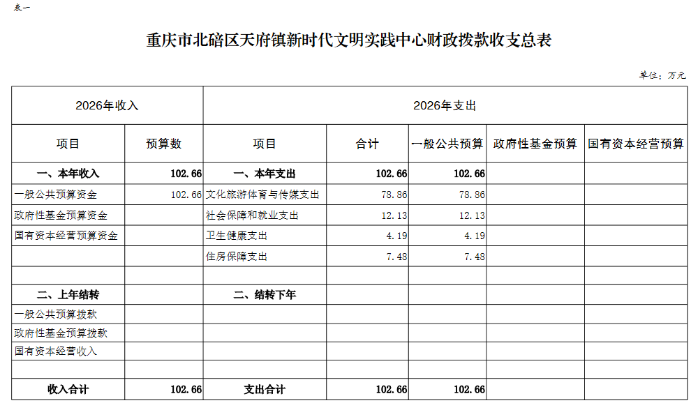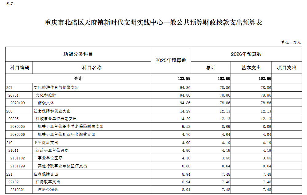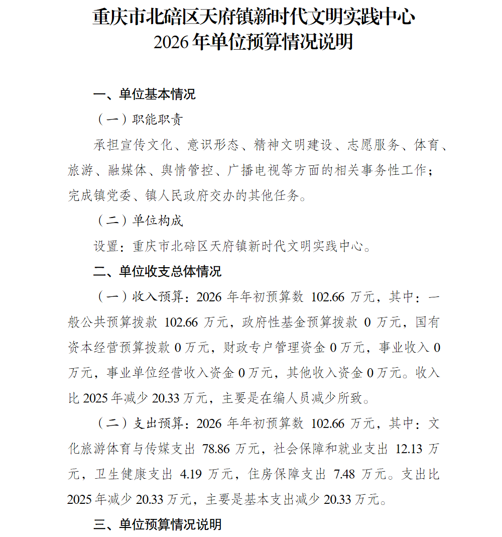 重庆市北碚区天府镇新时代文明实践中心2026年单位预算情况说明