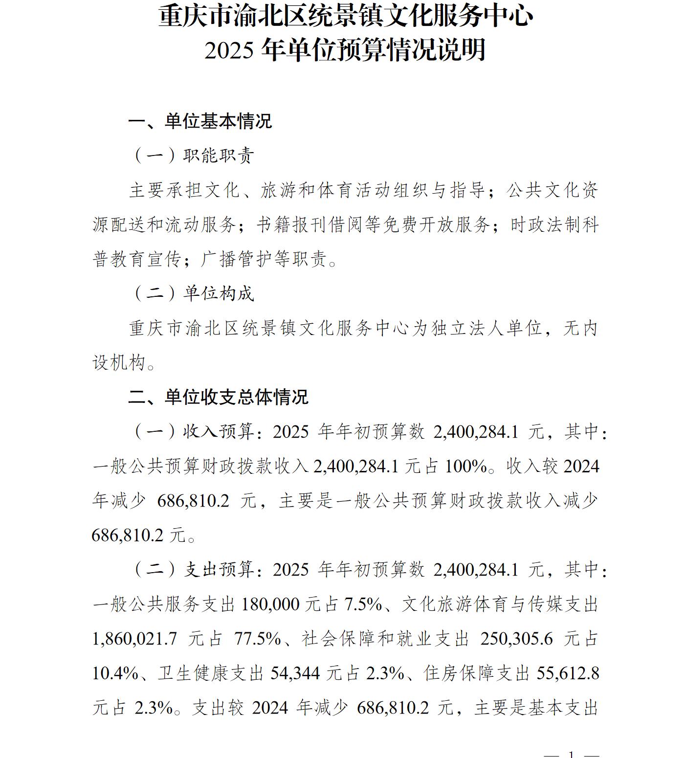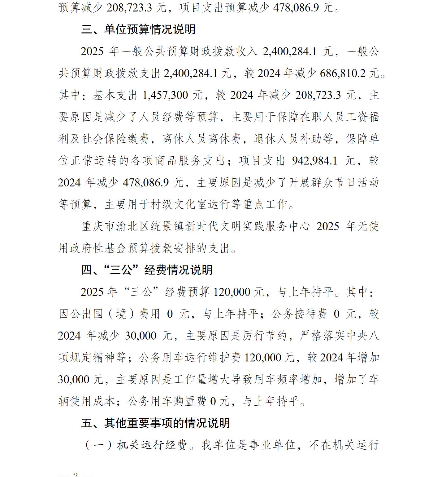 重庆市渝北区统景镇新时代文明实践服务中心2025年单位预算情况说明