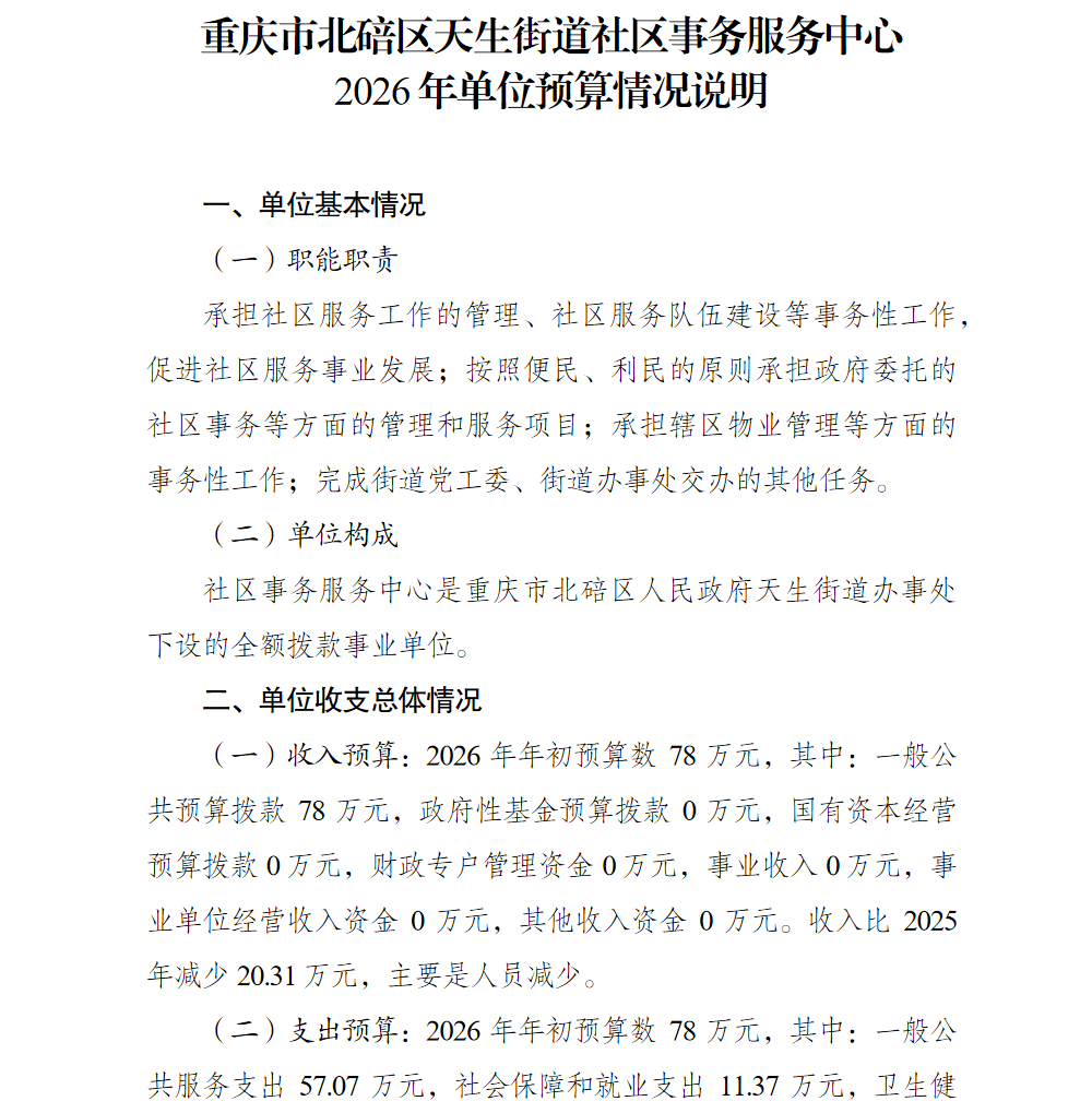 重庆市北碚区天生街道社区事务服务中心2026年单位预算情况说明