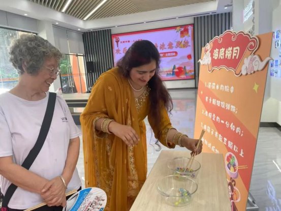 外国友人用筷子夹取碗中的玻璃球,看似简单的游戏却考验耐心与技巧,参与者们主动交流,分享自己的方法和窍门,一起沉浸在游戏的欢乐氛围中,营造了良好的活动氛围。