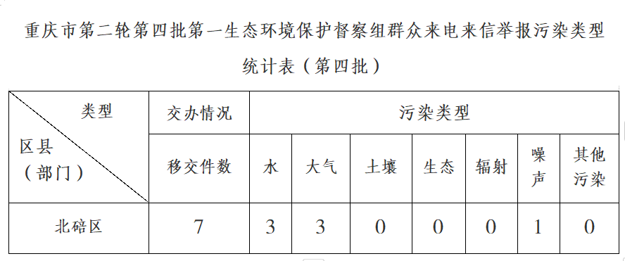 12月5日,重庆市第一生态环境保护督察组向北碚区交办第四批群众信访举报件7件。从信访举报件涉及的生态环境问题类型来看,涉及水3件,大气3件、噪声1件。