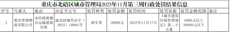 重庆市北碚区城市管理局2025年11月第三周行政处罚结果信息