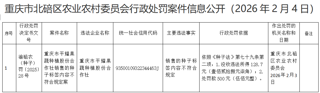 重庆市北碚区农业农村委员会行政处罚案件信息公开(2026年2月4日)