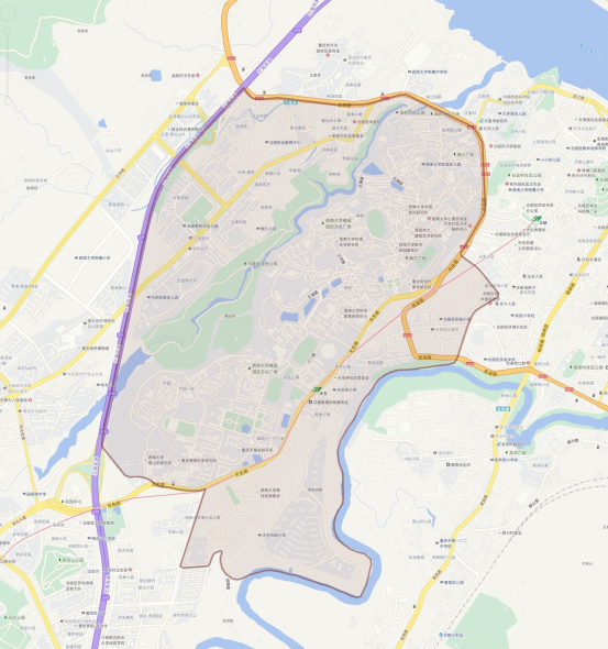 西南大学6号门→文溪路→文溪路与文浩路交汇处(左转)→文浩路→文浩路与文翰路交汇处(左转)→天岚支路→沿天岚支路向南到梁滩河西岸(左转)→沿梁滩河西岸→梁滩河与新星路交汇处(龙凤溪公园所在地)→新星路→新星路与天新路交汇处(左转)→天新路→天新路与天生路交汇处(右转)→天生路→北泉路→北泉路与兰海高速交汇处(左转)→兰海高速→兰海高速与西南大学边界交汇处(左转)→西南大学边界沿线→西南大学6号门。