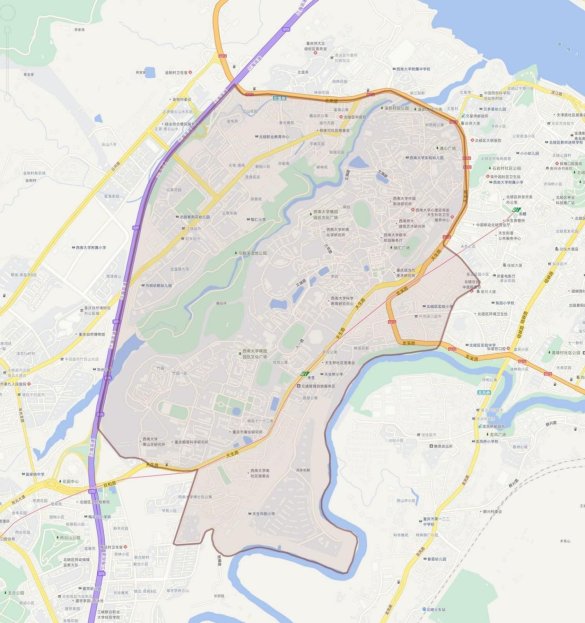 一、禁止露天烧烤区域为封闭型区域,具体覆盖范围为:西南大学6号门→文溪路→文溪路与文浩路交汇处(左转)→文浩路→文浩路与文翰路交汇处(左转)→天岚支路→沿天岚支路向南到梁滩河西岸(左转)→沿梁滩河西岸→梁滩河与新星路交汇处(龙凤溪公园所在地)→新星路→新星路与天新路交汇处(左转)→天新路→天新路与天生路交汇处(右转)→天生路→北泉路→北泉路与兰海高速交汇处(左转)→兰海高速→兰海高速与西南大学边界交汇处(左转)→西南大学边界沿线→西南大学6号门。
