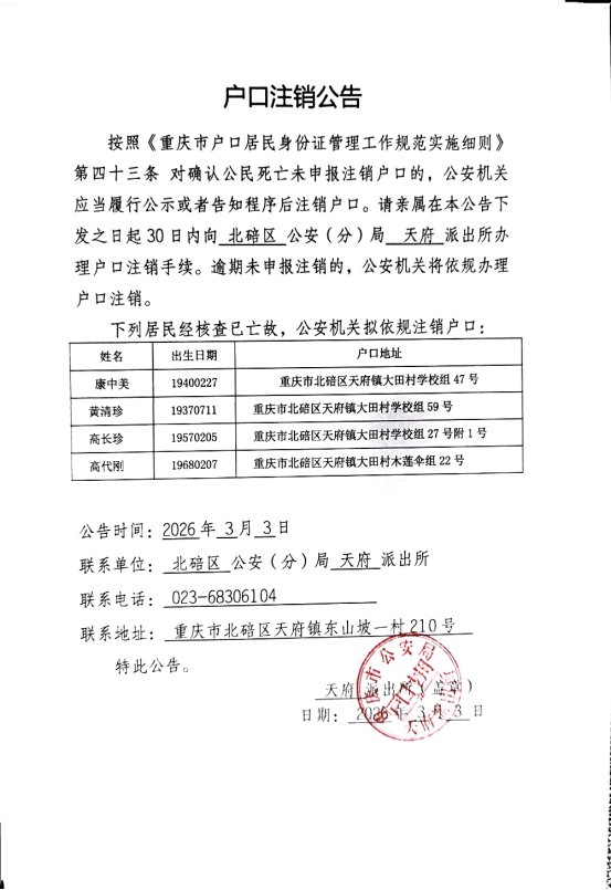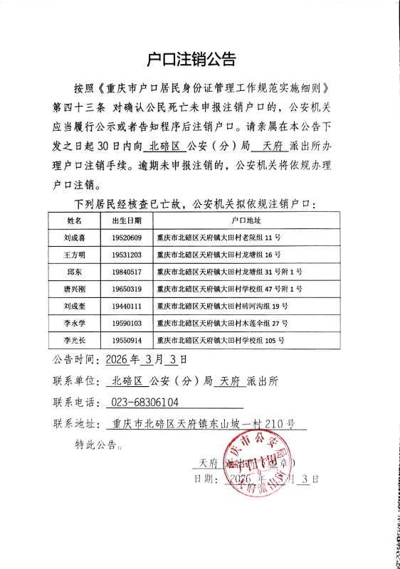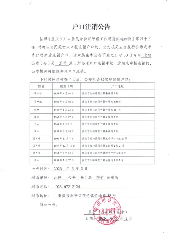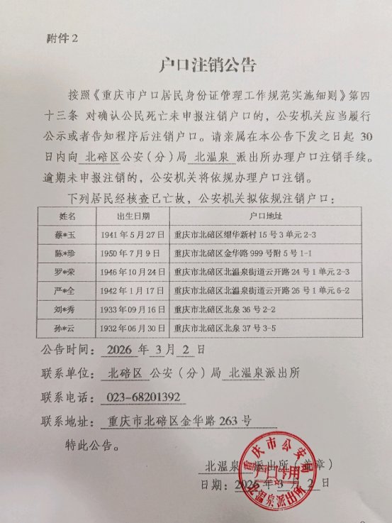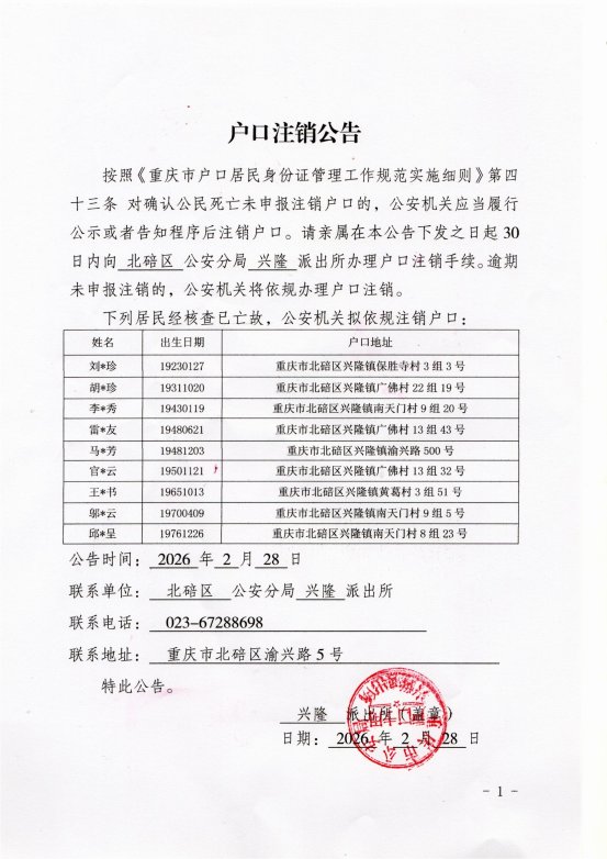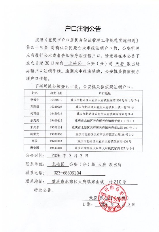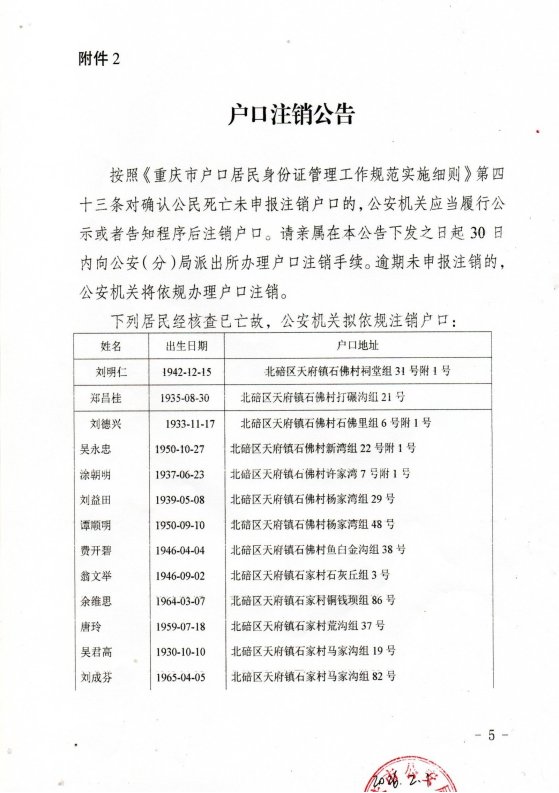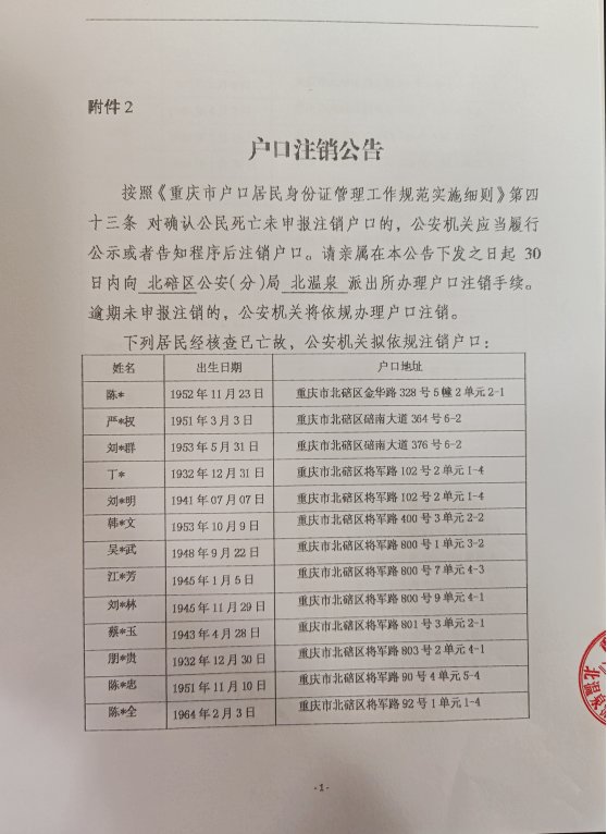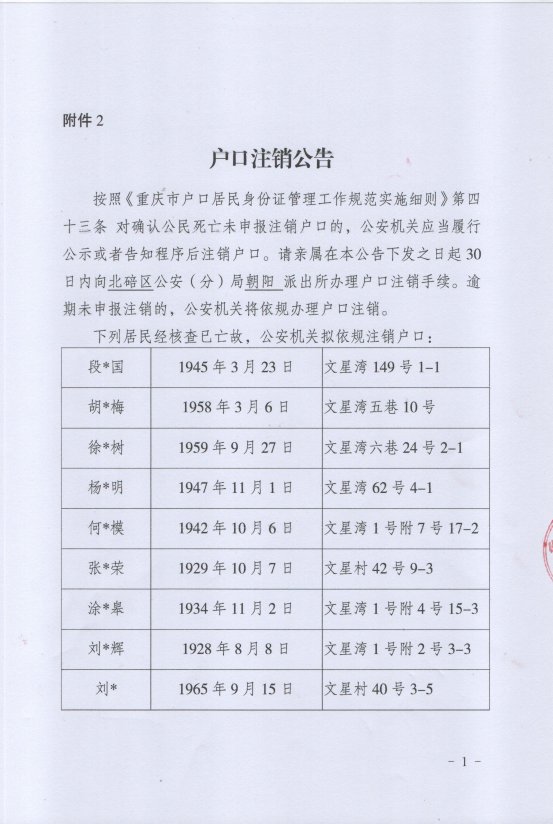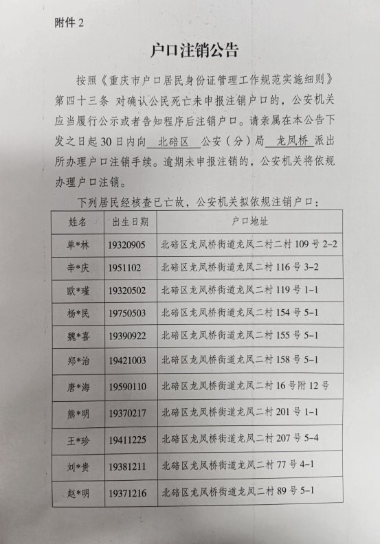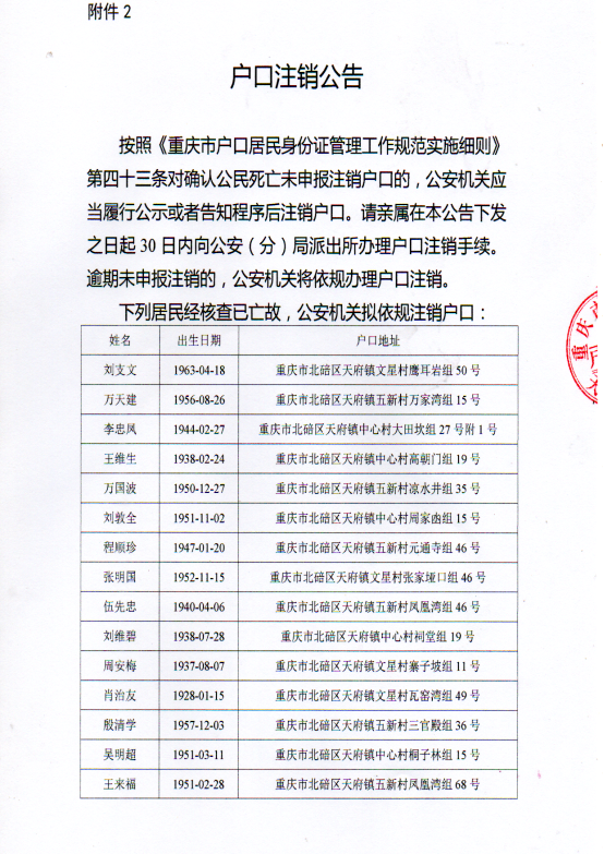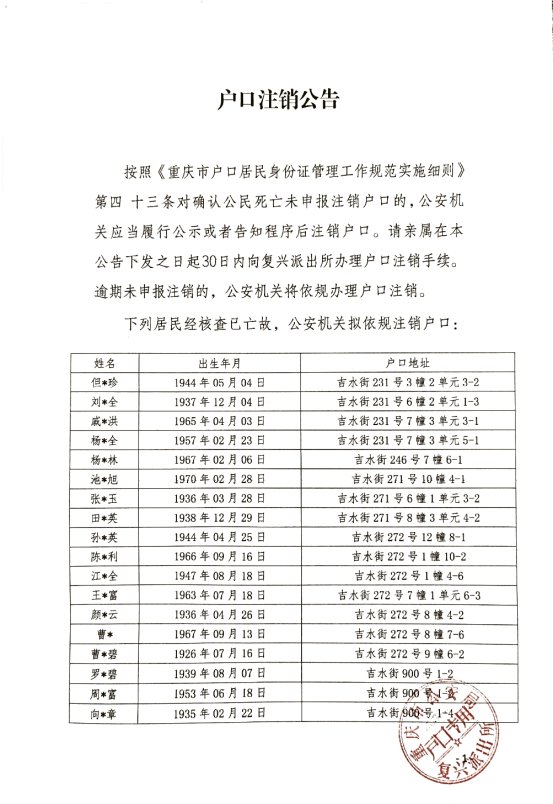 按照《重庆市户口居民身份证管理工作规范实施细则》第四十三条 对确认公民死亡未申报注销户口的,公安机关应当履行公示或者告知程序后注销户口。经核实,以下居民已亡故,公安机关拟依规注销户口,现予以公告: