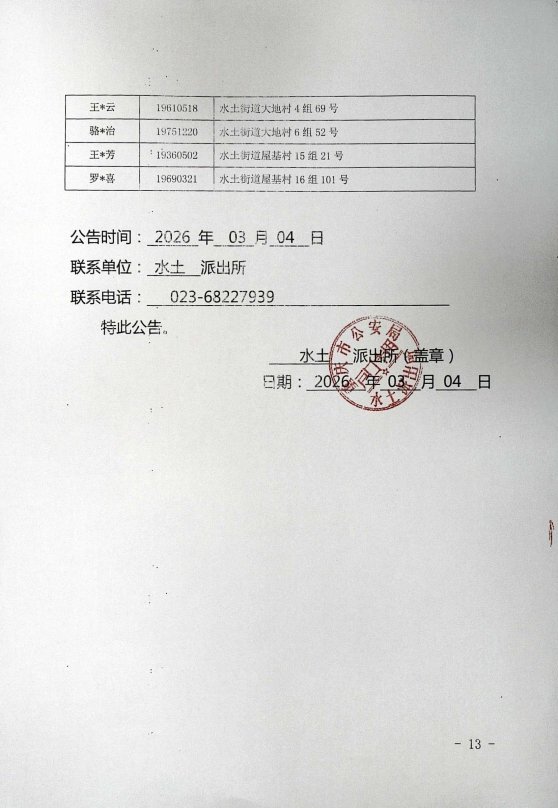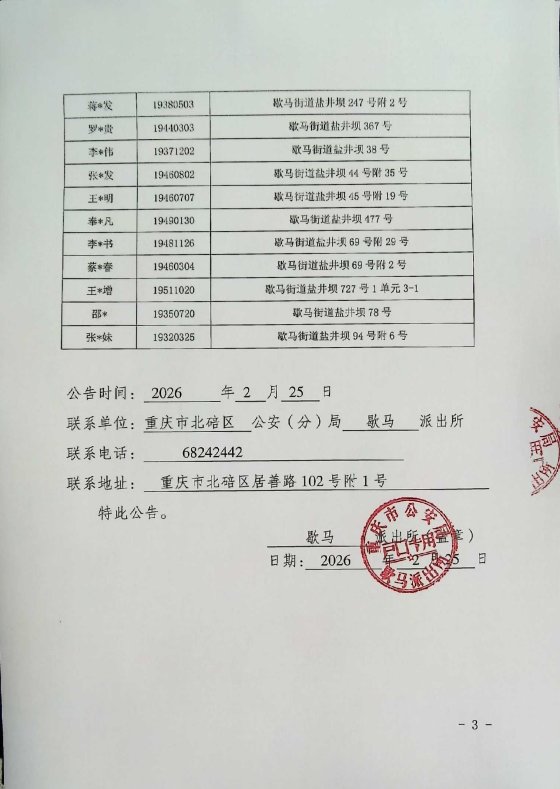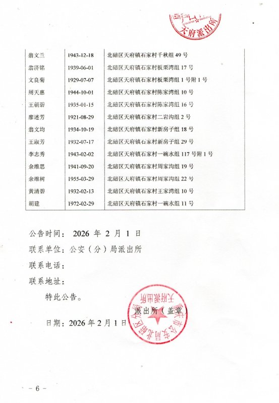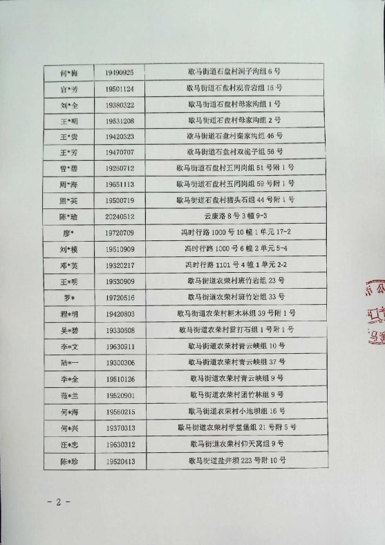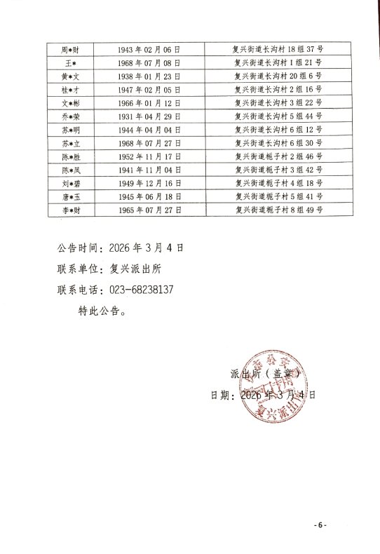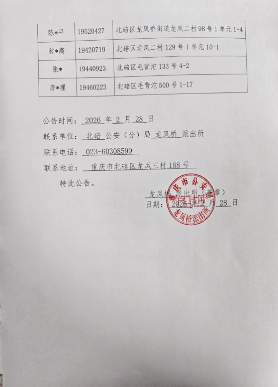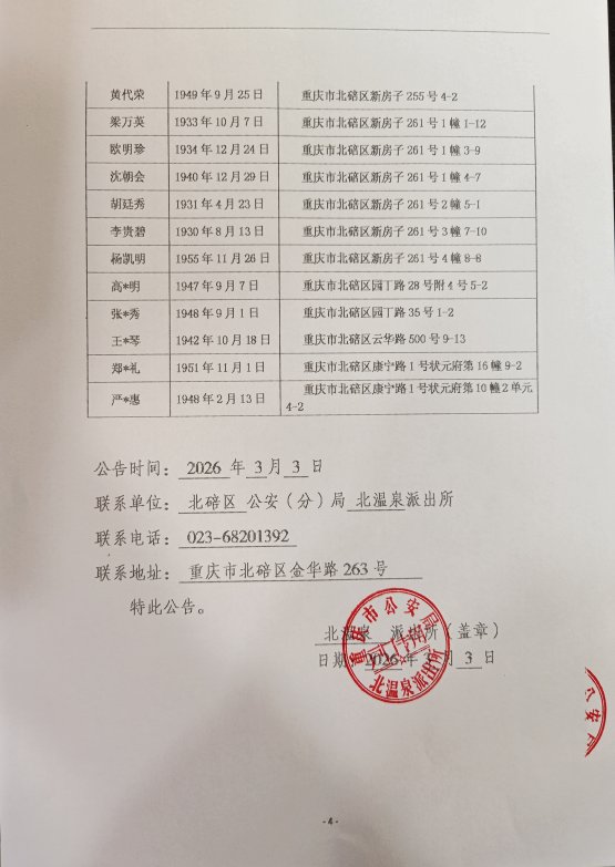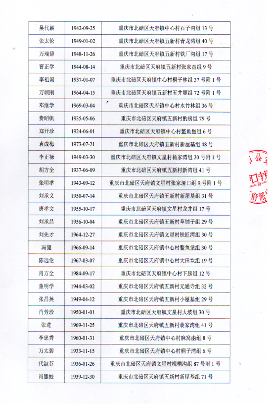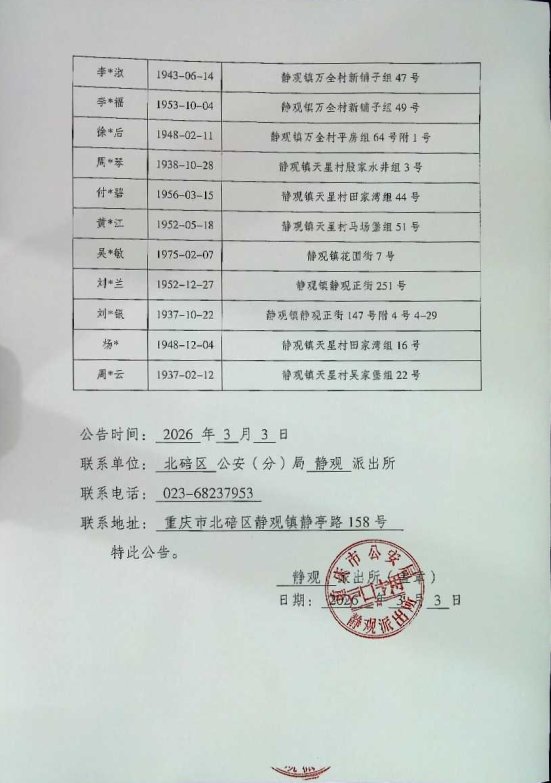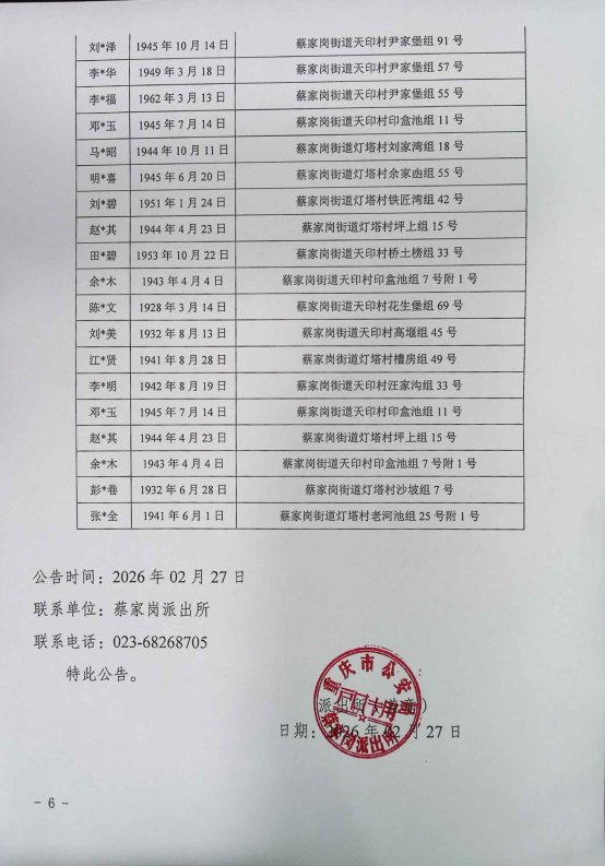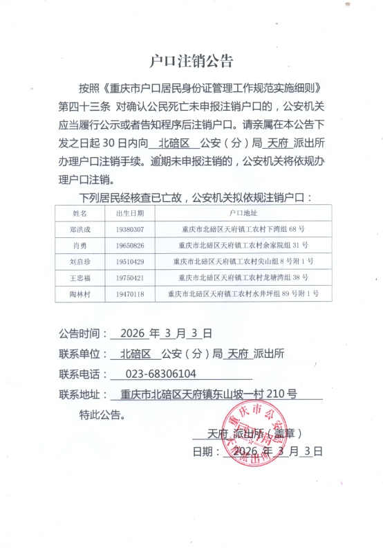 按照《重庆市户口居民身份证管理工作规范实施细则》第四十三条 对确认公民死亡未申报注销户口的,公安机关应当履行公示或者告知程序后注销户口。经核实,以下居民已亡故,公安机关拟依规注销户口,现予以公告: