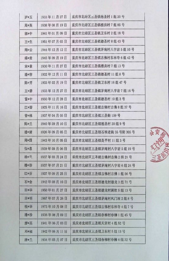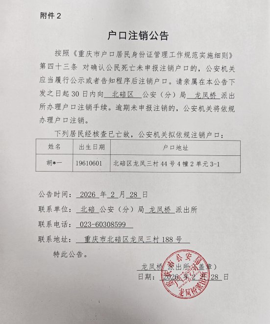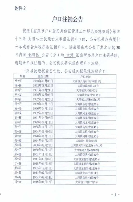 按照《重庆市户口居民身份证管理工作规范实施细则》第四十三条 对确认公民死亡未申报注销户口的,公安机关应当履行公示或者告知程序后注销户口。经核实,以下居民已亡故,公安机关拟依规注销户口,现予以公告: