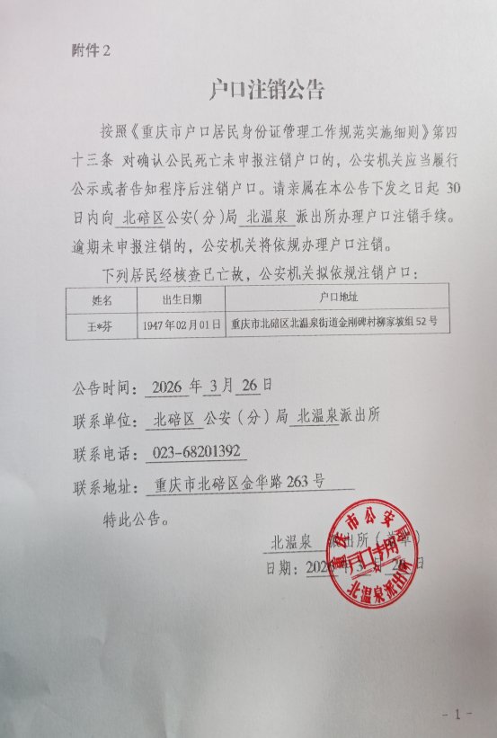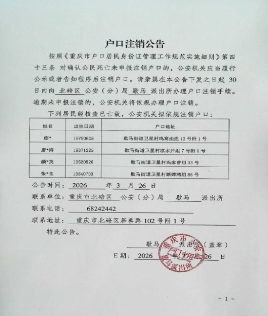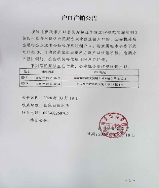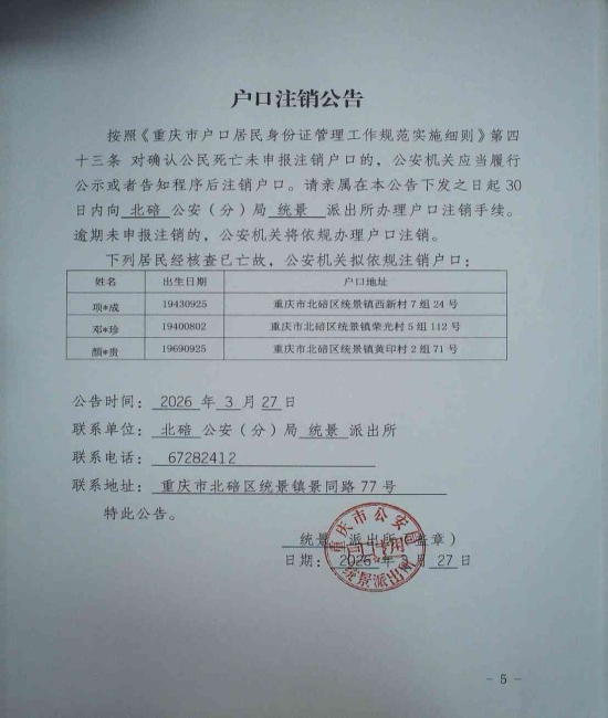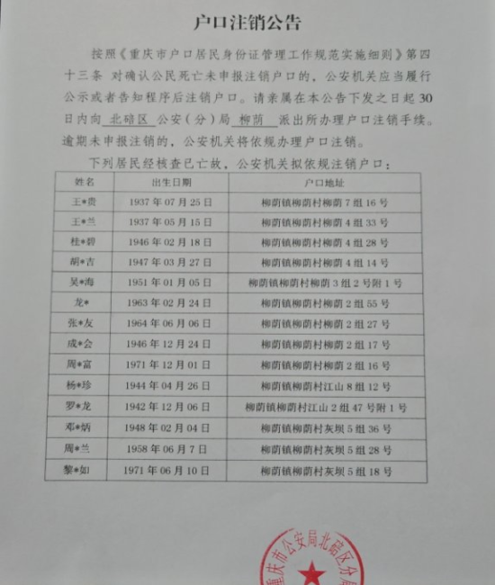 按照《重庆市户口居民身份证管理工作规范实施细则》第四十三条 对确认公民死亡未申报注销户口的,公安机关应当履行公示或者告知程序后注销户口。经核实,以下居民已亡故,公安机关拟依规注销户口,现予以公告: