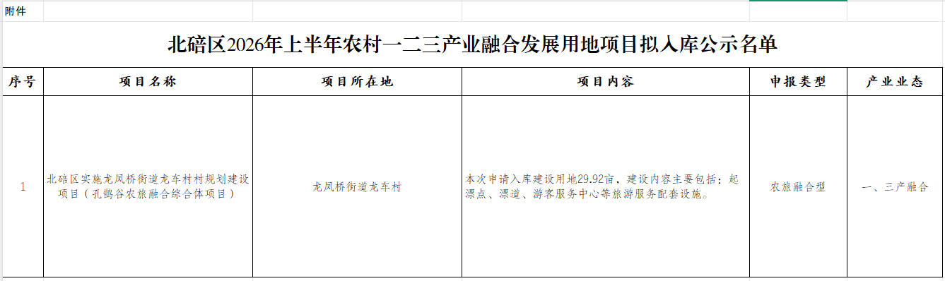 按照重庆市北碚区规划和自然资源局、重庆市北碚区发展和改革委员会、重庆市北碚区农业农村委员会《关于转发<保障和规范农村一二三产业融合发展用地实施细则>的通知》(北碚规资发〔2022〕61号)和和重庆市北碚区农业农村委员会《关于开展2026年上半年农村一二三产业融合发展用地项目入库申报工作的通知》(北碚农业农村委〔2026〕29号)文件要求,我委联合区规划自然资源局、区发展改革委、区经济信息委、区生态环境局、区文化旅游委、区林业局、国网北碚供电公司成立评审组,对申报项目开展综合评审。经评审,北碚区实施龙凤桥街道龙车村村规划建设项目(孔鹊谷农旅融合综合体项目)符合入库条件,拟纳入北碚区2026年农村一二三产业融合发展用地项目库。现将评审结果予以公示,公示期2026年4月1日—4月8日。