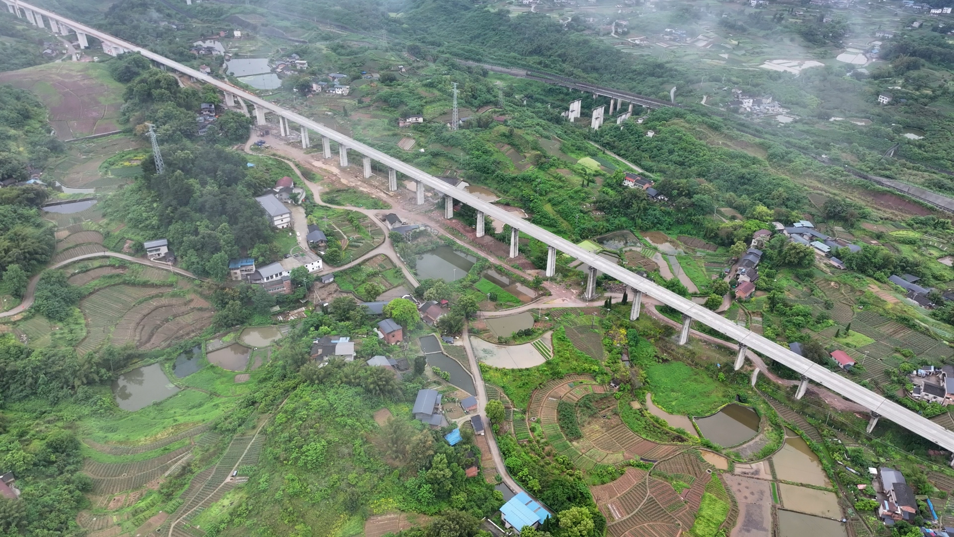 据悉,沙湾特大桥是渝西高铁全线中施工难度大、精度要求高、安全风险较为突出的重点工程之一。全桥共设42个墩台,最高墩达32米,先后跨越东环线铁路泄水洞、斜井、G244国道等多个区域,施工精度要求高、安全风险突出。自2023年5月开工以来,建设者克服桥址区域地形起伏大、周边居民集中密集等困难,采用预制架设与现浇结合等工艺,最终按期实现全桥架梁贯通。