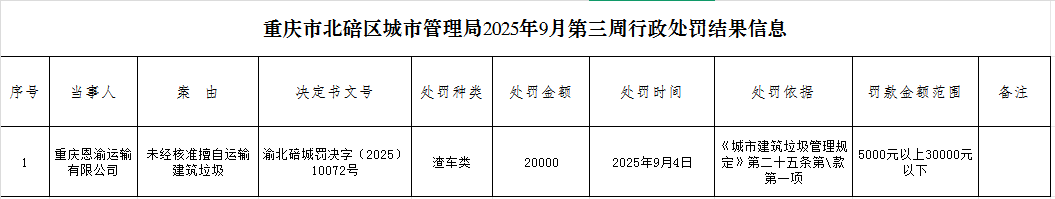 重庆市北碚区城市管理局2025年9月第三周行政处罚结果信息
