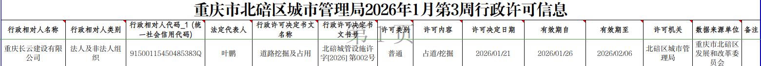 重庆市北碚区城市管理局2026年1月第3周行政许可结果信息
