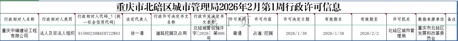 重庆市北碚区城市管理局2026年2月第1周行政许可结果信息