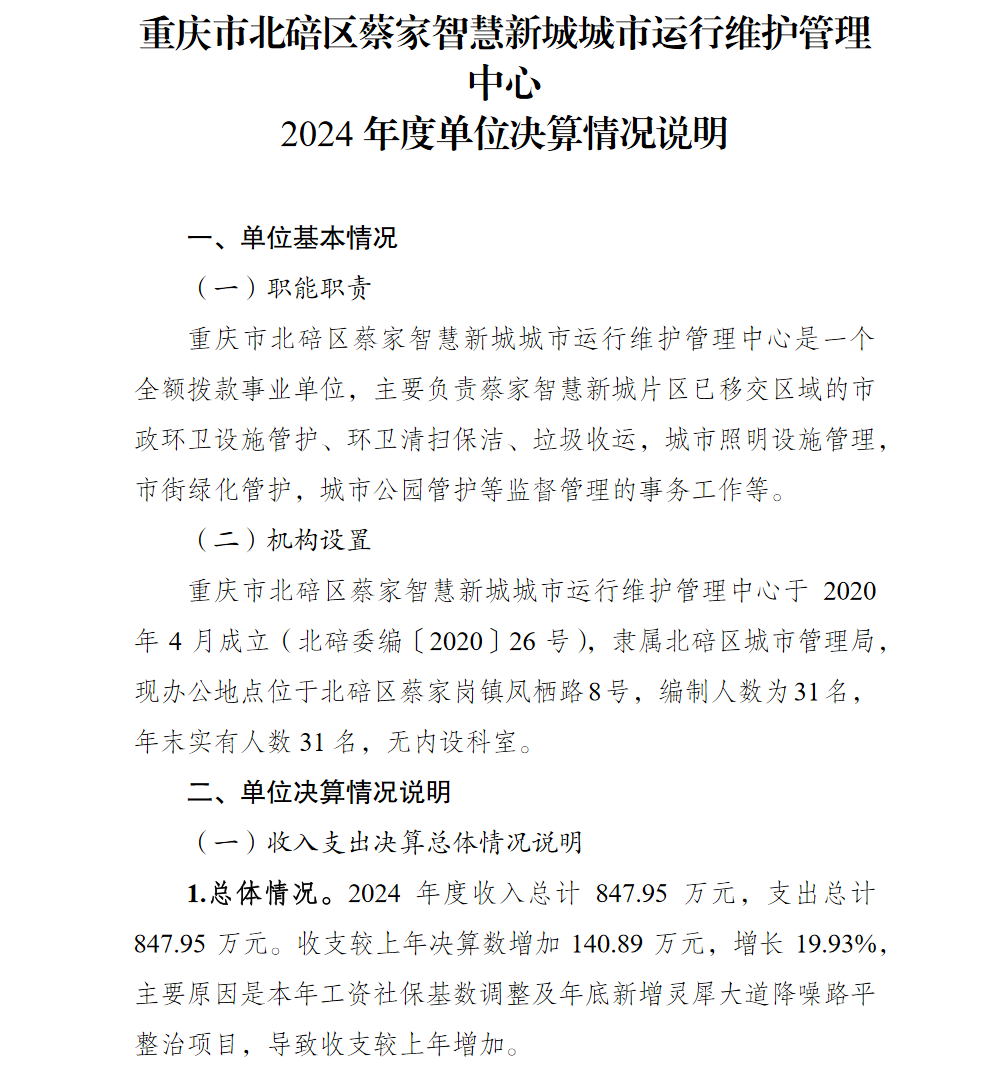重庆市北碚区蔡家智慧新城城市运行维护管理中心2024年单位决算情况说明