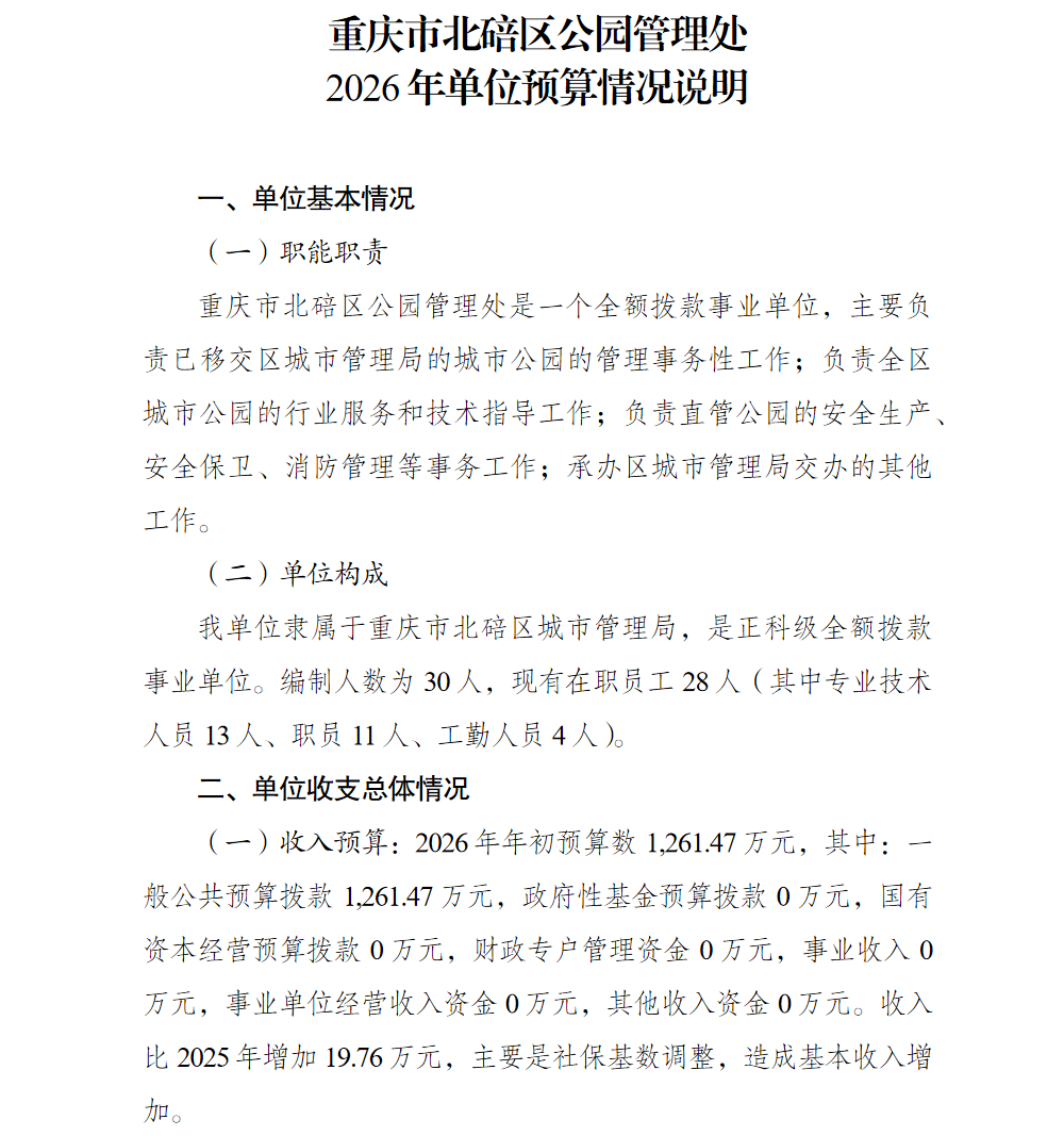 重庆市北碚区公园管理处2026年单位预算情况说明