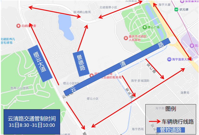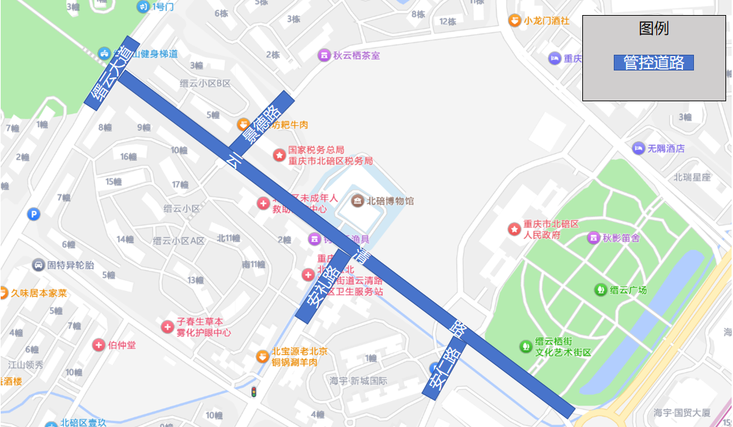 重点拥堵路段:缙云大道卢作孚路口至云华路口;安礼路云清路口至卢作孚路口。