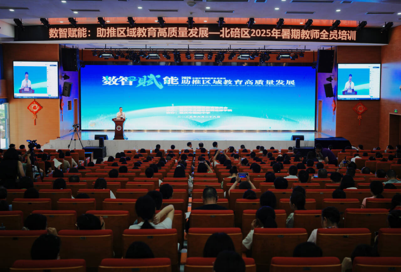 6月28日上午,北碚区2025年暑假教师全员培训在重庆市朝阳中学启动。本次培训以“数智赋能:助推区域教育高质量发展”为主题,以人工智能与教育深度融合为主线,采用线上与线下相结合的方式,覆盖区内外100余个分会场,10000余名教职工,同时跨区域联动酉阳、丰都及四川省宜宾市叙州区教师,共筑成渝双城经济圈教育协同发展新平台。根据不同学段、学科教师的需求,采用通识与学科相结合,分层分类设计本次暑假全员培训内容。面向全区教师构建了“区级培训引领—教共体培训协同—校本培训深耕”三级赋能的北碚特色培训体系。