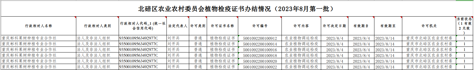 北碚区农业农村委员会植物检疫证书办结情况2023年8月第一批
