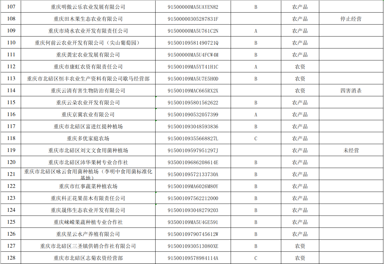 重庆市农资和农产品生产经营主体信用等级评定汇总表(北碚区)