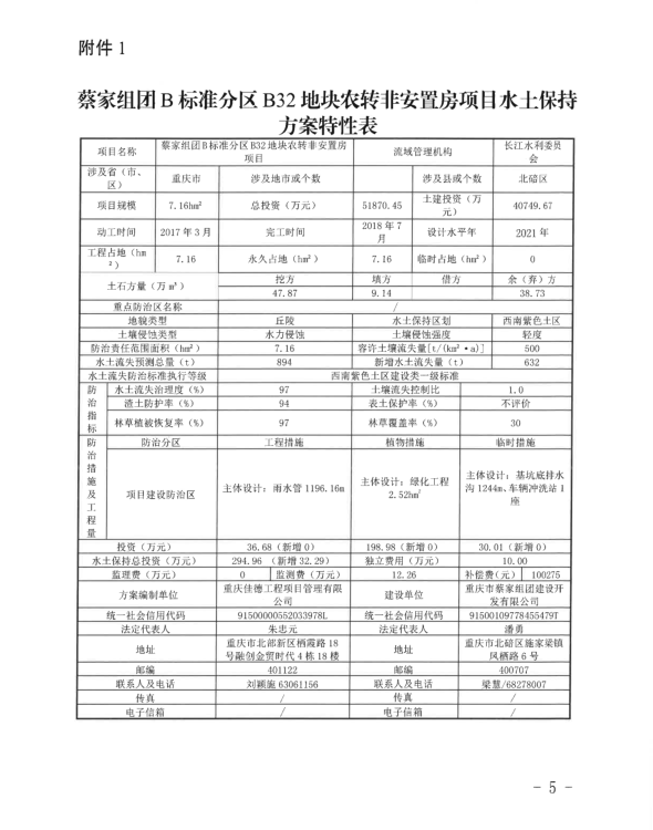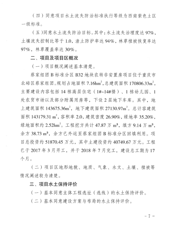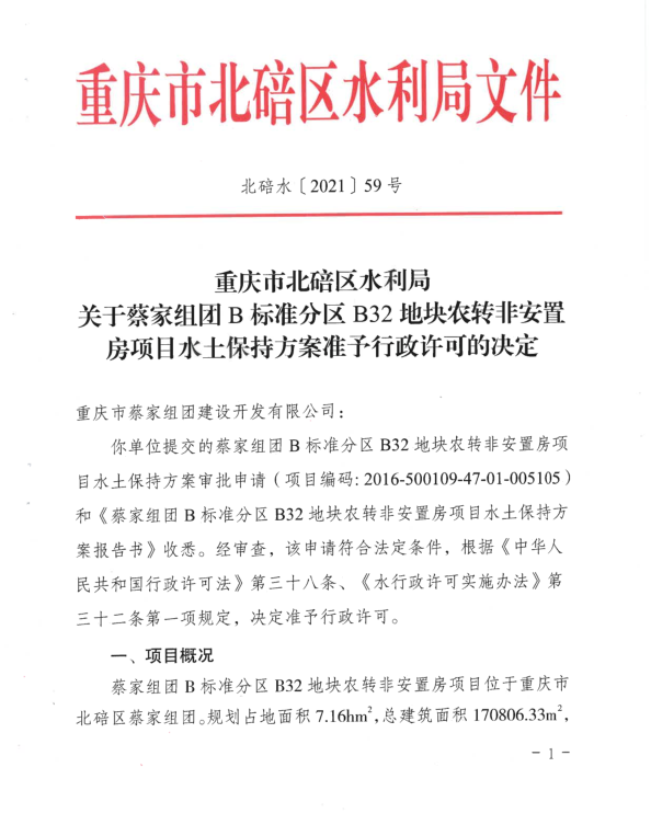 重庆市北碚区水利局关于蔡家组团B标准分区B32地块农转非安置房项目水土保持方案准予行政许可的决定