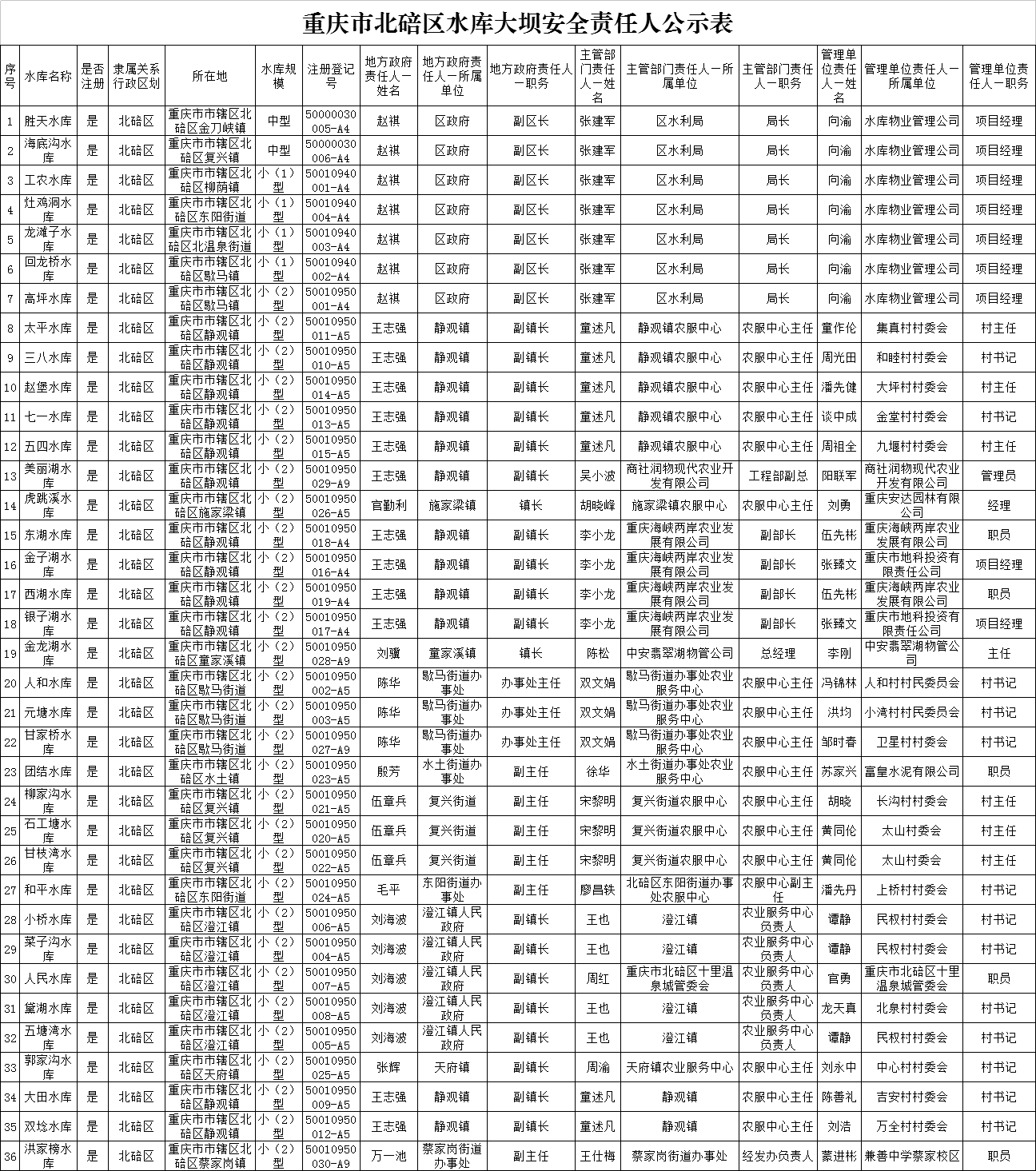 重庆市北碚区水库大坝安全责任人公示表