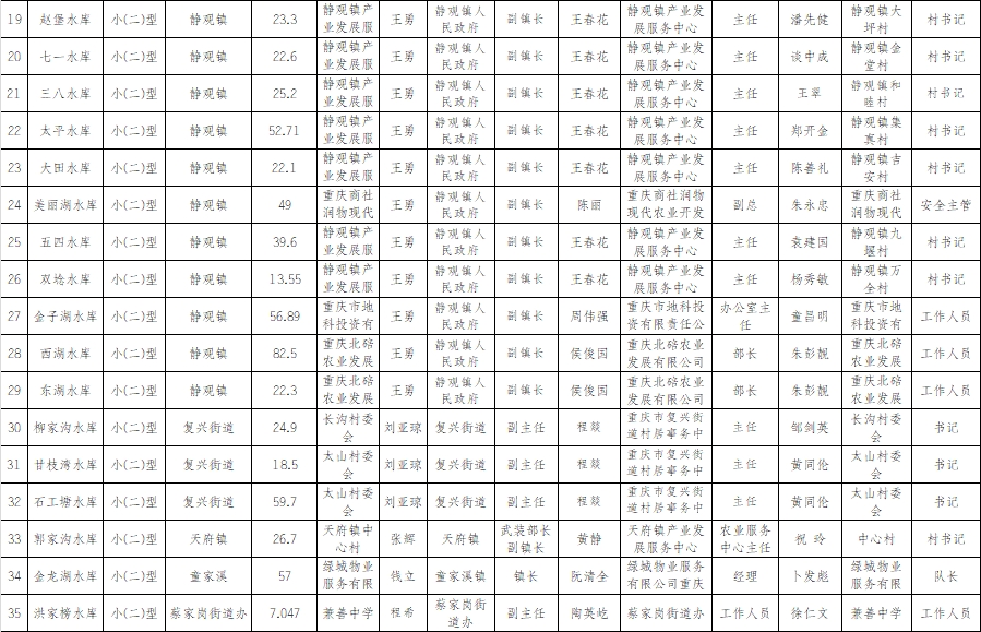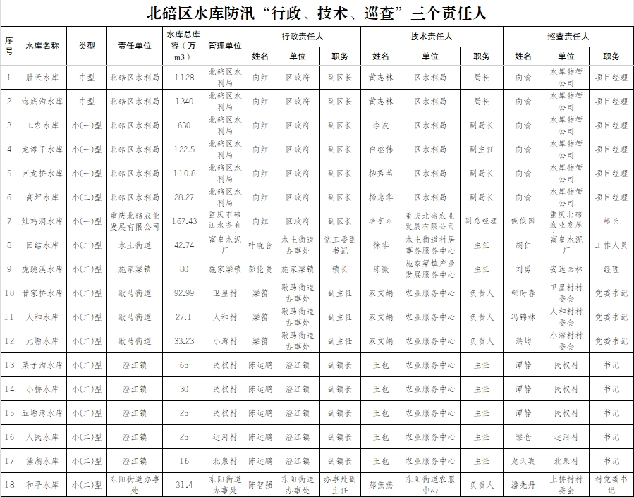 北碚区水库防汛“行政、技术、巡查”三个责任人公示表(2025年)