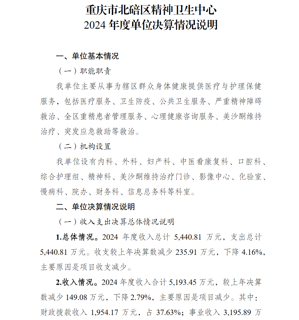 重庆市北碚区精神卫生中心2024年单位决算情况说明
