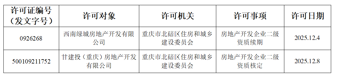 重庆市北碚区住房和城乡建设委员会行政许可结果事项公告(房地产开发企业资质2025年第十四批)