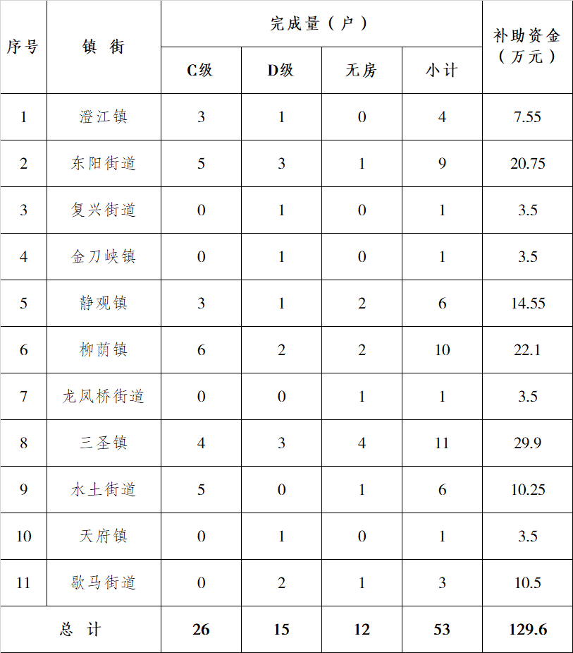 北碚区2024年第二批农村低收入群体危房改造完成户数及补助资金统计表