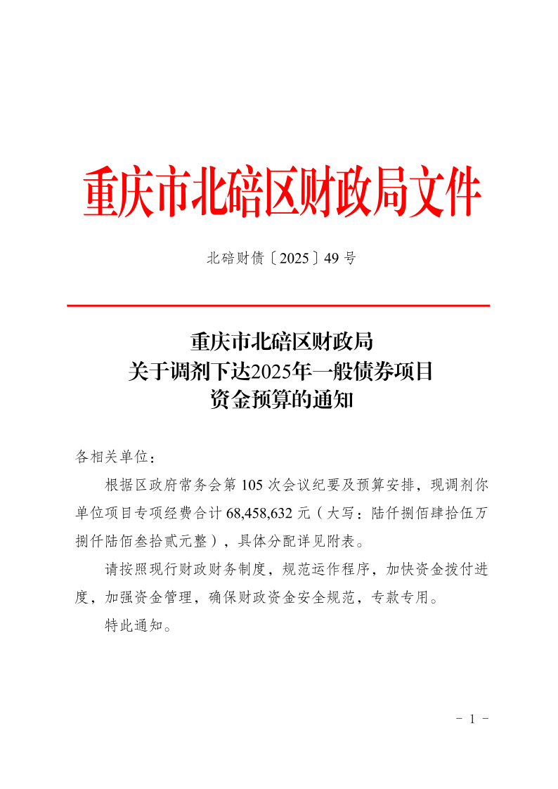 重庆市北碚区财政局关于调剂下达2025年一般债券项目资金预算的通知