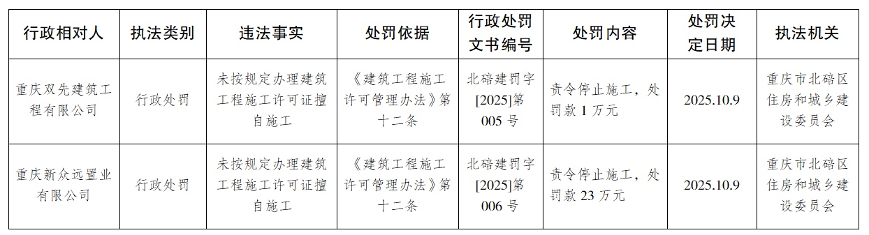 重庆市北碚区住房和城乡建设委员会行政处罚情况(2025年10月9日—2025年10月11日)