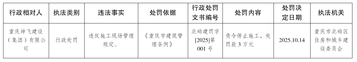 重庆市北碚区住房和城乡建设委员会行政处罚情况(2025年10月13日—2025年10月17日)